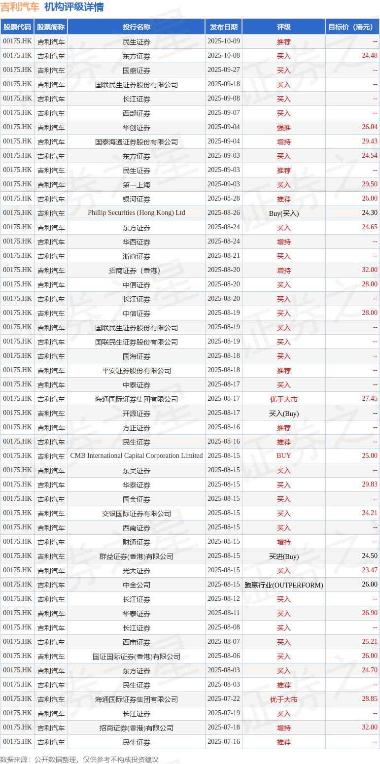 2025-10-11股票推荐,今日牛股,短线股票推荐,明日股票推荐,热门板块分析/每日精选A股潜力牛股,覆盖短线爆发股与长线价值股,附技术图形、资金动向与题材热点分析,助您提前抓住风口,精准进场!截至2025年10月9日收盘,吉利汽车(00175.HK)报收于19.75港元,上涨0.41%,成交量7571.73万股,成交额14.84亿港元。投行对该股的评级以买入为主,近90天内共有29家投行给出买入评级,近90天的目标均价为26.71港元。民生证券最新一份研报给予吉利汽车推荐评级。
