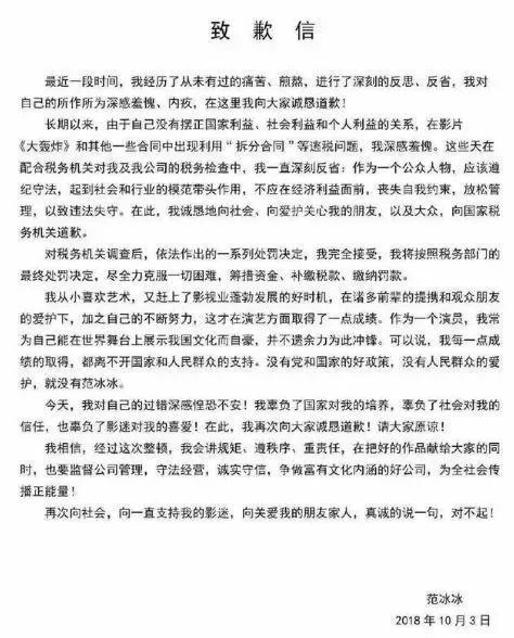 10月3日新华社讯,自6月初范冰冰的涉税问题被举报后,江苏等地税务机关开展调查,今日正式公布了最终结果。范冰冰在电影《大轰炸》拍摄过程中实际获得片酬 3000 万元,其中的 1000 万元申报纳税,其余 2000 万以拆分合同方式偷逃个人所得税 618 万,少缴营业税及附加 112 万元,合集 730 万元;范冰冰及其担任法人的企业少缴税 2.48 亿元,其中偷逃税款 1.34 亿元。最终范冰冰需要补齐的税款和罚金约为 8.84 亿元。