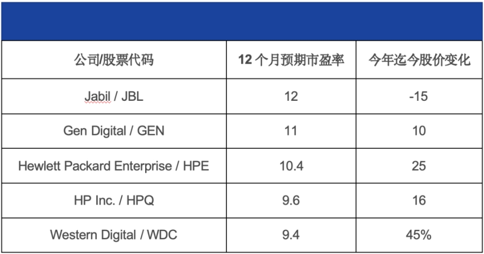 不过,并非每家科技公司的估值溢价都这么高。《巴伦周刊》根据12个月预期市盈率,从标普500信息技术指数中筛选出了五只最便宜的股票,它们分别是西部数据(WDC)、惠普(HPQ)、慧与(HPE)、Gen Digital (GEN)和捷普(JBL)。