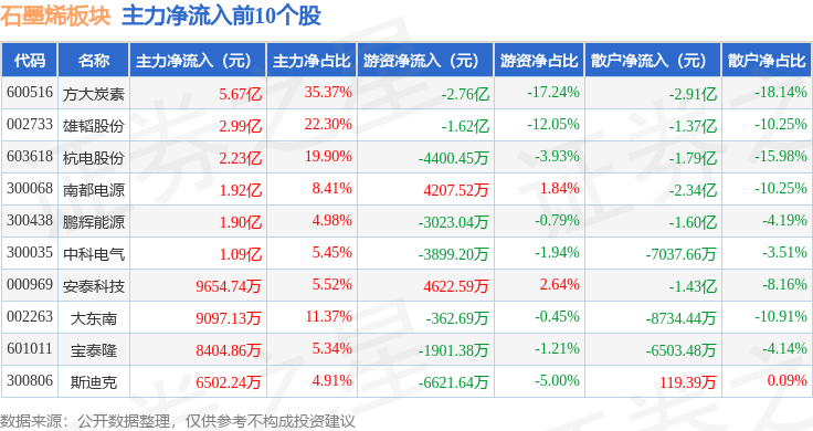 从资金流向上来看,当日石墨烯板块主力资金净流入9.02亿元,游资资金净流出3.46亿元,散户资金净流出5.55亿元。石墨烯板块个股资金流向见下表: