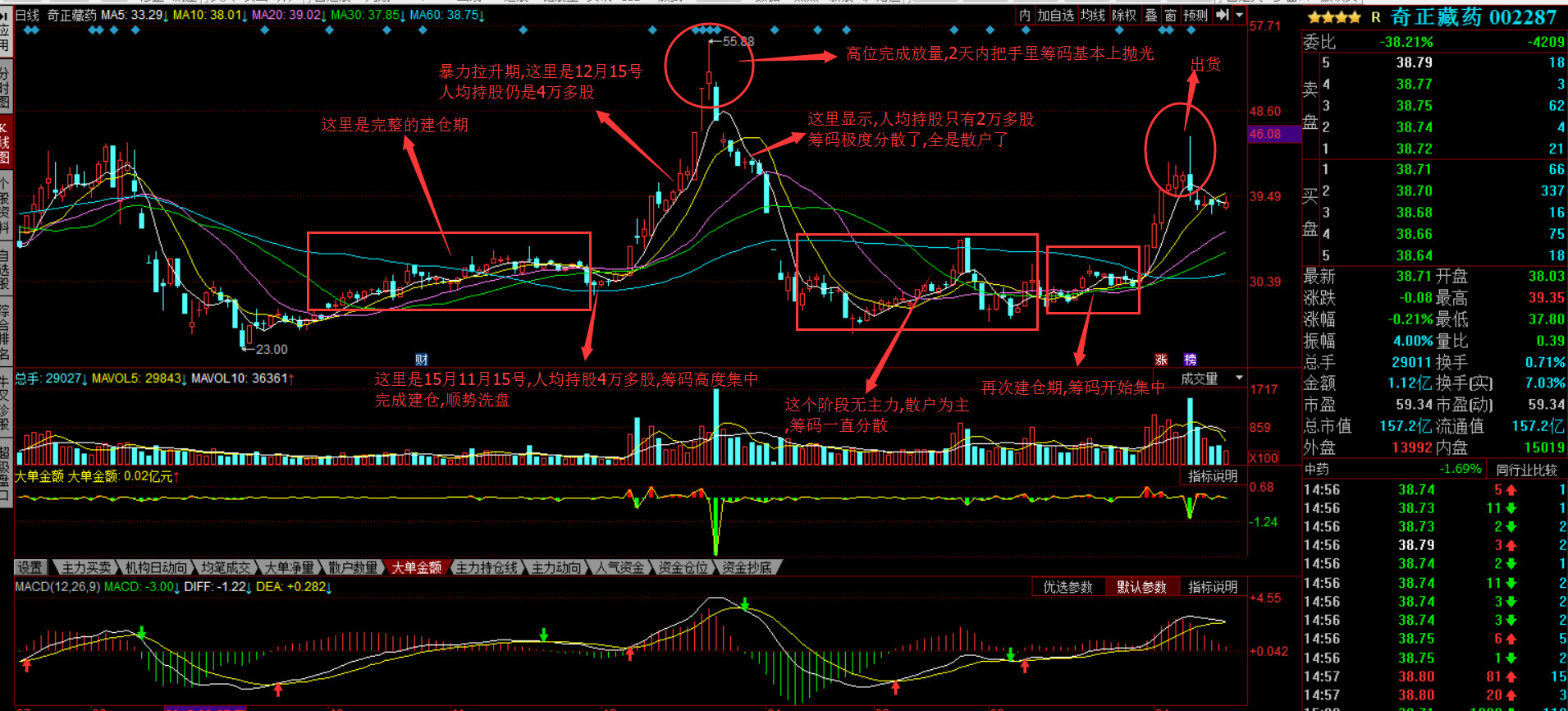这是第一轮炒作,从收集完筹码到拉升到派发,人均持股的变化,基本上揭露了完整的做庄的手法和派发的时间。