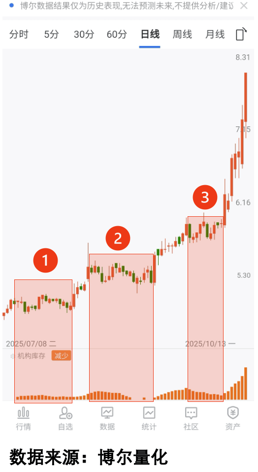 还有更夸张的——看图2里的股票,42天只涨了2%,放在2025年的牛市里简直“丢人”,但“机构库存”数据37天都是活跃的。后来怎么样?后面30天直接翻倍!很多人会问:“中间有几天没机构库存,是不是大资金跑了?”其实不是,偶尔一两天没数据很正常,只要大部分时间活跃,就说明大资金没走。