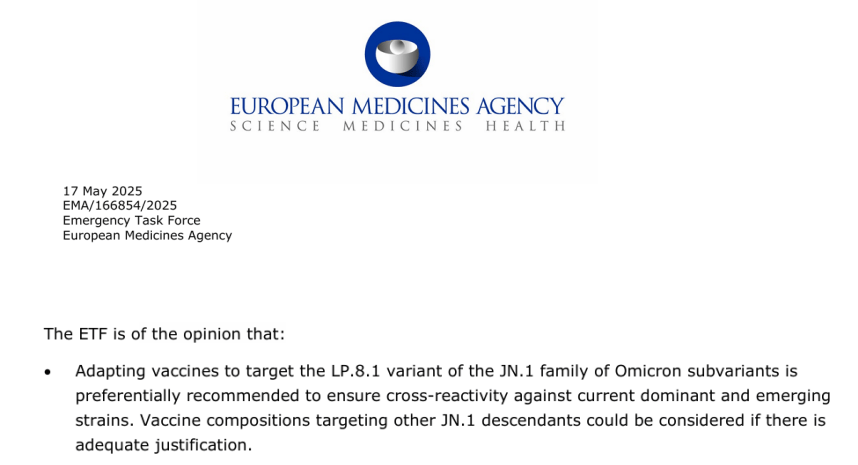 2025年5月,欧洲药品管理局(EMA)建议更新COVID-19疫苗的抗原成分,以用于2025-2026年疫苗接种。EMA紧急工作组(ETF)认为:
