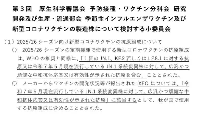 日本厚生劳动省2025年5月28日召集专家委员会,研讨了2025/2026年季节性流感与新冠疫苗的制造株选择。建议2025年/2026年日本使用的新冠疫苗抗原成分可包括: