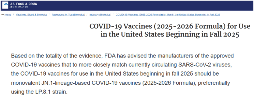 基于整体证据,FDA建议获批新冠疫苗制造商,为了更接近当前流行的SARS-CoV-2病毒,自2025年秋季起在美国使用的COVID-19疫苗应为单价JN.1谱系新冠疫苗(2025-2026配方),优先使用LP.8.1株。