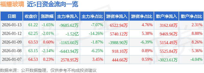 股票行情快报:福耀玻璃(600660)1月13日主力资金净卖出968562万元股票推荐官网_今日牛股+明日潜力股全解析_短线+长线策略每日更新