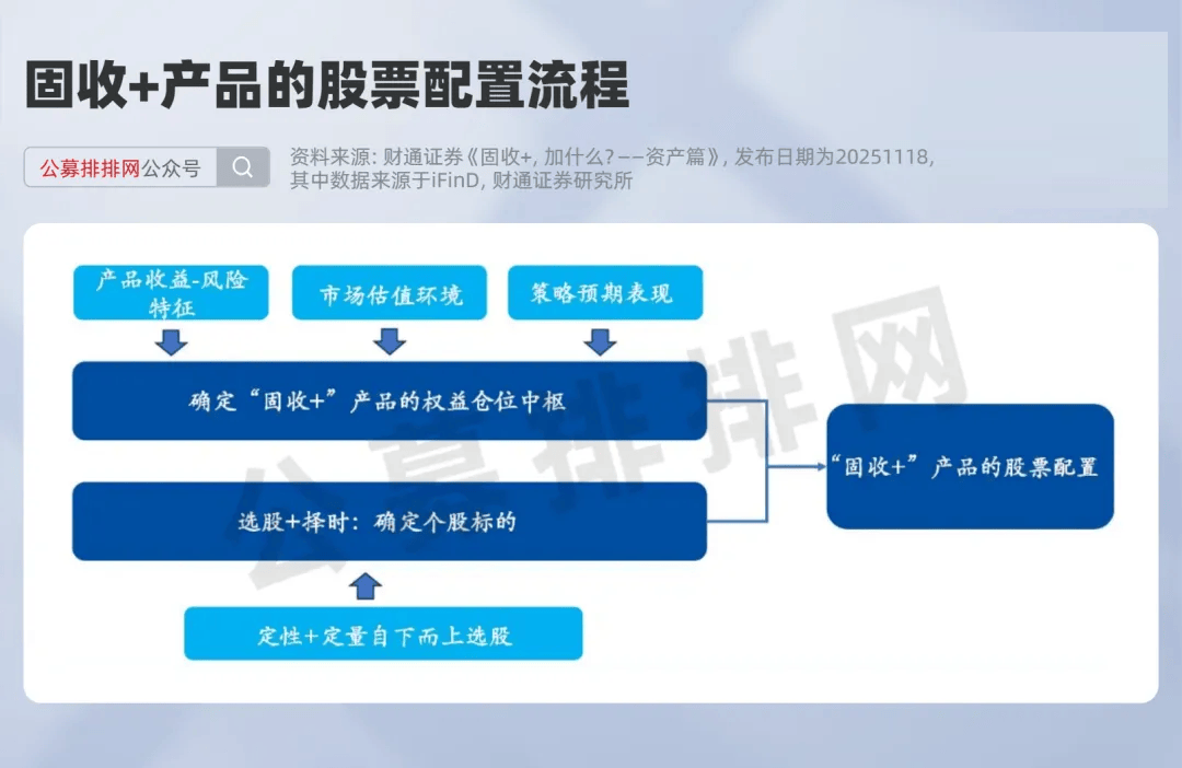 固收+通常以债券作为底仓,区别在它“+”的部分。就拿其股票配置流程来说,不同的产品会基于产品收益-风险特征、市场估值环境和策略预期表现,确定权益仓位中枢;接着,通过选股和择时确定个股标的,并采用定性加定量自下而上选股方法。这些步骤协同形成完整的股票配置策略。