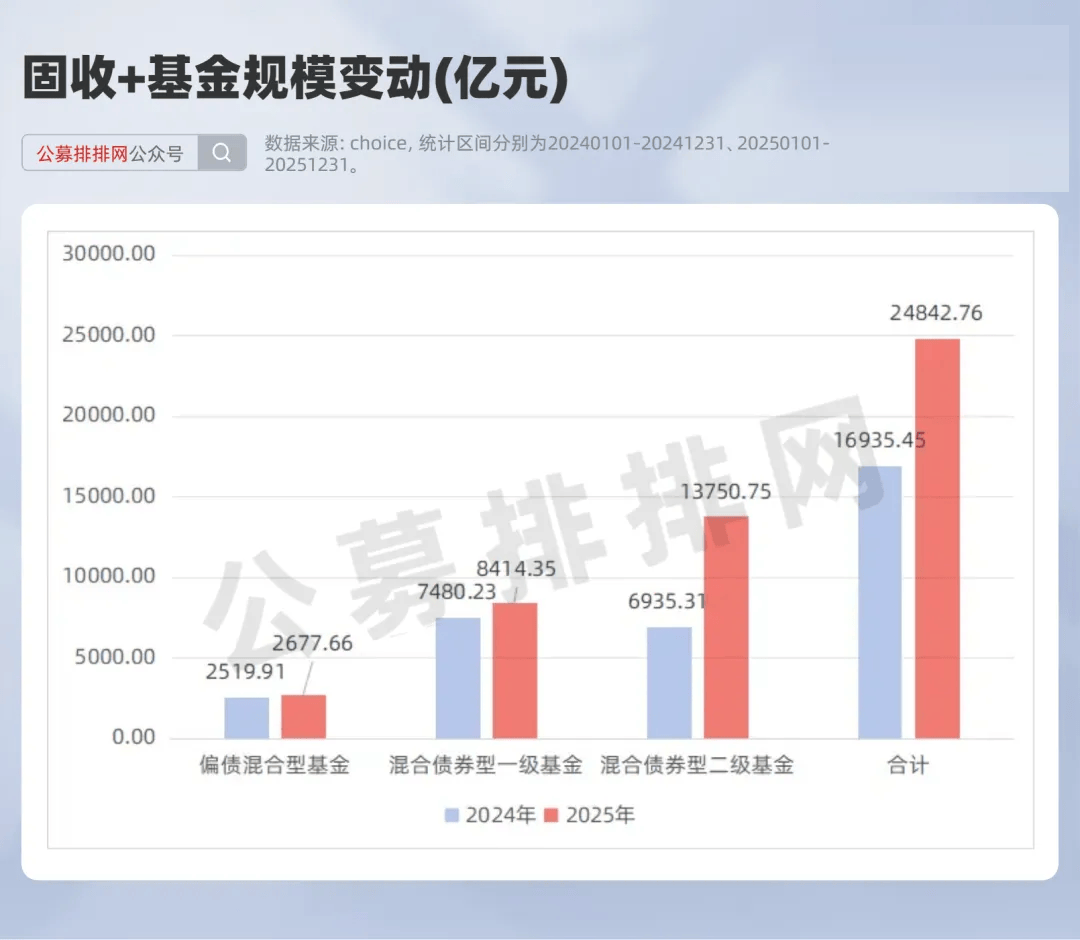 截至2025年末,固收+基金规模已达2.48万亿元,同比增速为46.69%,体现出居民及机构在低利率与权益市场波动加大环境下对“求稳收益+低波动”资产的配置需求。