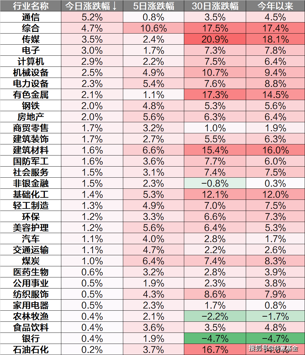 行业上看,通信、综合、传媒等板块上涨,石油石化、银行、食品饮料板块涨幅靠后。
