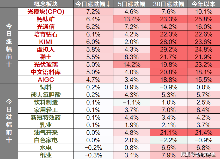 概念主题上看,光模块(CPO)、钙钛矿、光通信等板块上涨,纸业、水电、白色家电等板块下跌。