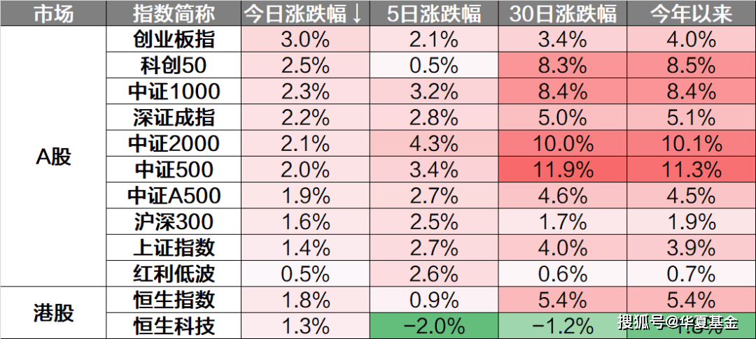 市场高开高走。核心宽基指数悉数上涨,创成长、科创创业50领涨,红利指数、中证红利涨幅靠后。