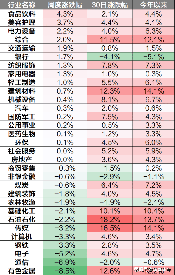 本周申万一级31个行业涨跌相近,食品饮料、美容护理、电力设备和综合等板块涨幅靠前,有色金属、通信、电子和钢铁等板块跌幅靠前。