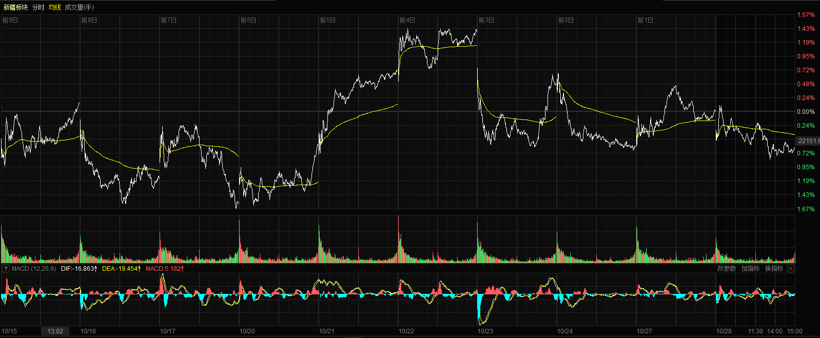 10月28日收盘时,新疆板块指数跌0.64%,报收22139.22点,13只股票上涨,47只股票下跌,1只股票平盘,个股上涨比例为21.31%,总换手率1.69%,总成交额195.57亿元。