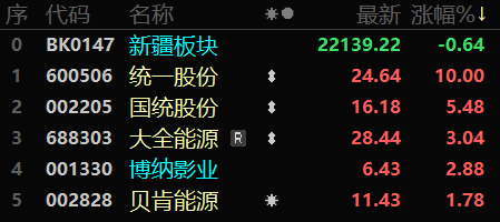 今日,统一股份上涨10.00%,报收24.64元;国统股份上涨5.48%,报收16.18元;大全能源上涨3.04%,报收28.44元;博纳影业上涨2.88%,报收6.43元;贝肯能源上涨1.78%,报收11.43元。百花医药、金风科技、八一钢铁、科力股份、天富能源跌幅居前。