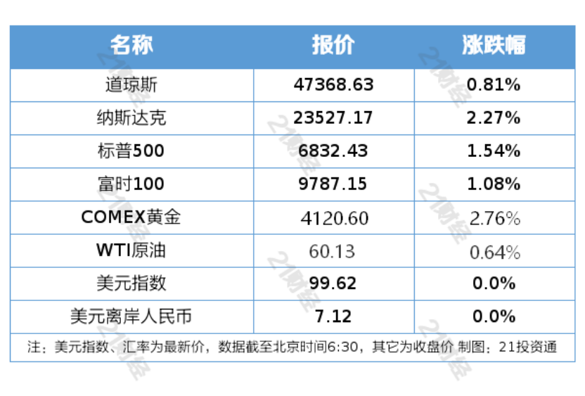 纽约股市三大股指11月10日显著上涨。截至当天收盘,道琼斯工业平均指数比前一交易日上涨381.53点,收于47368.63点,涨幅为0.81%;标准普尔500种股票指数上涨103.63点,收于6832.43点,涨幅为1.54%;纳斯达克综合指数上涨522.64点,收于23527.17点,涨幅为2.27%。